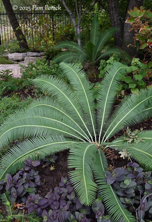 Stepping into the back garden, you walk through a small woodland garden, where feathery dioon is underplanted with purple heart.