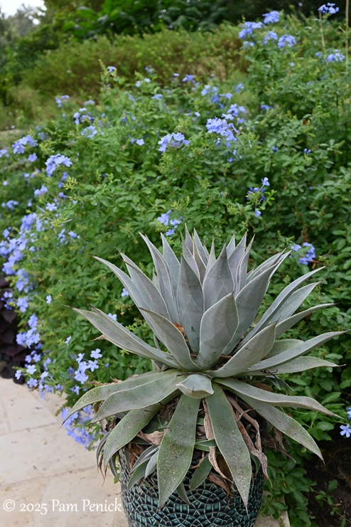 Along the winding front walk, Queen Victoria and other small agaves mingle with twoflower melicgrass (Melica mutica), a Texas native that I almost mistook for ‘Everillo’ sedge, thanks to its yellow-green foliage.