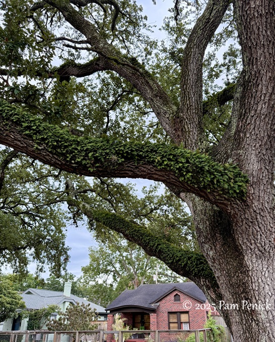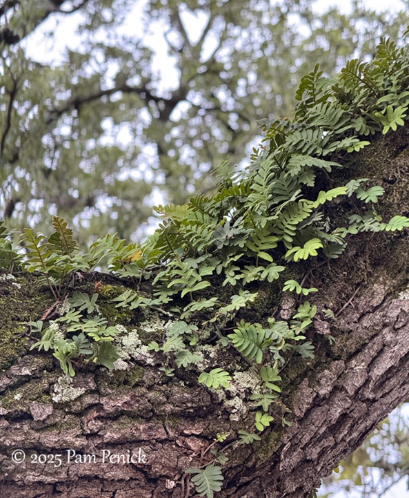 Later, on a walk around the block, resurrection fern (Polypodium polypodioides) cloaking live oak limbs caught my eye.