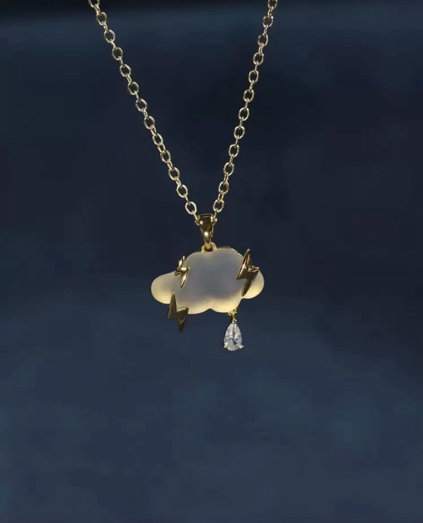 Cloud and Lightning Bolt With Raindrops On Gold Necklace – Cubic Zirconia