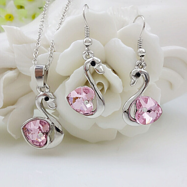 Pink Blue Rhinestones Swan Silver Necklace And Earrings Set Costume Jewellery