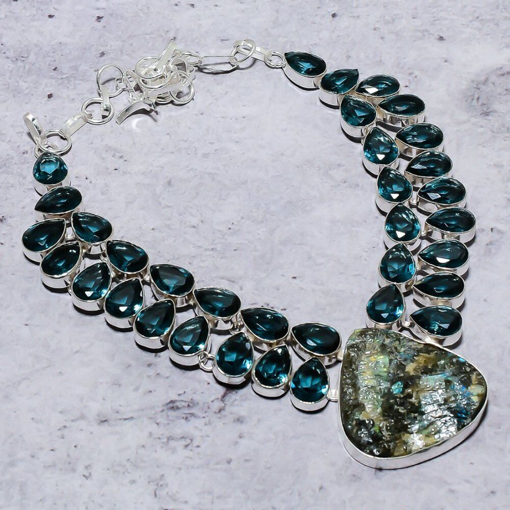 Natural Labradorite, Iolite Gemstone 925 Sterling Silver Necklace 18″ Gift M297