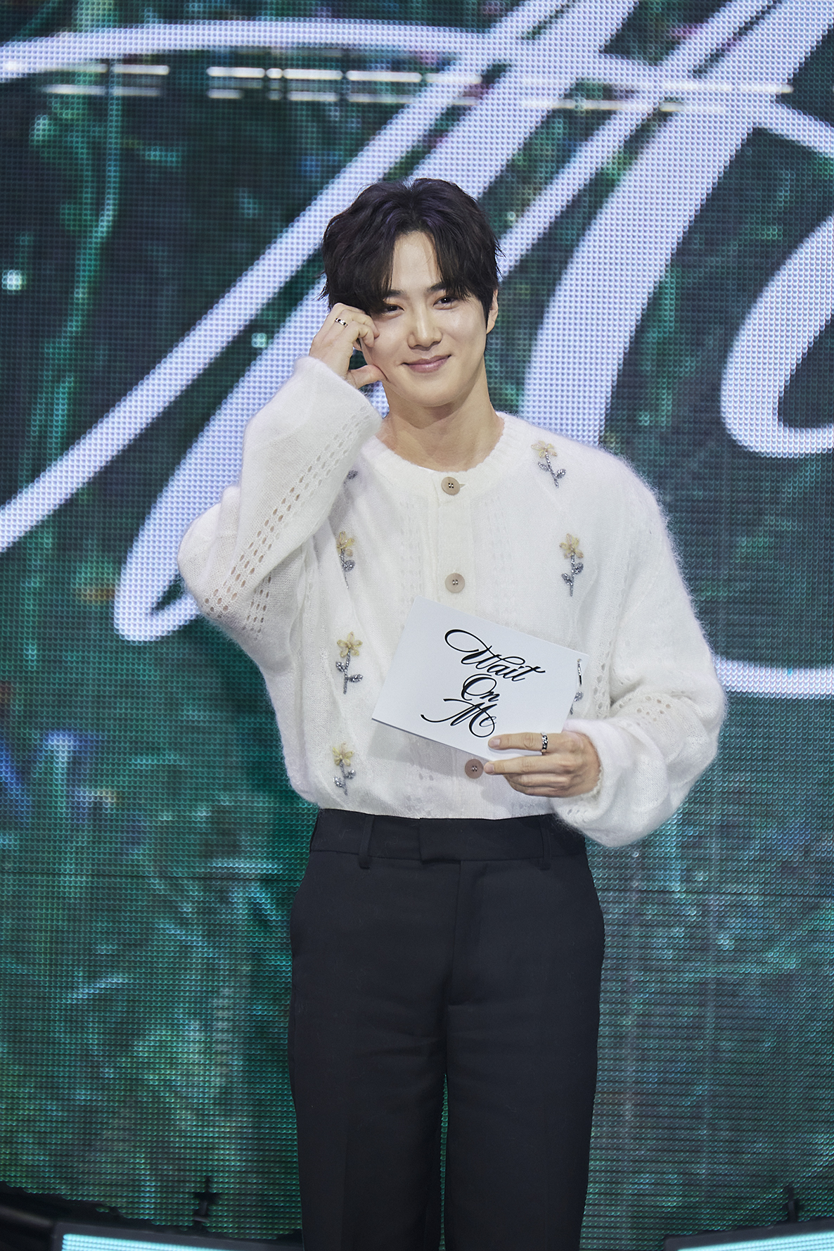 As Kai prepared for his performance showcase of “Wait On Me,” Suho bantered with the reporters, raising anticipation for Kai’s stage and also teasing that he is preparing for a new album himself. He continued to praise “world-class Kai,” saying, “Please show lots of love for his fourth mini album ‘Wait On Me,’” jokingly adding, “And please show lots of love for me as well.”