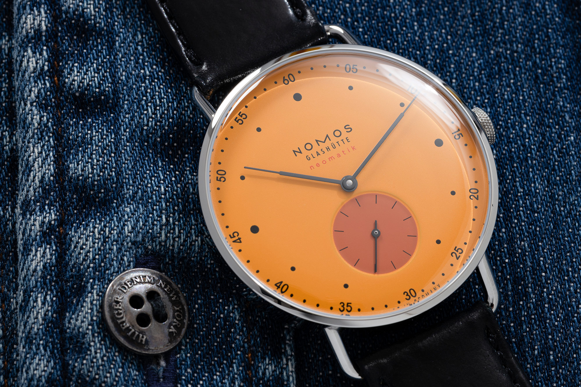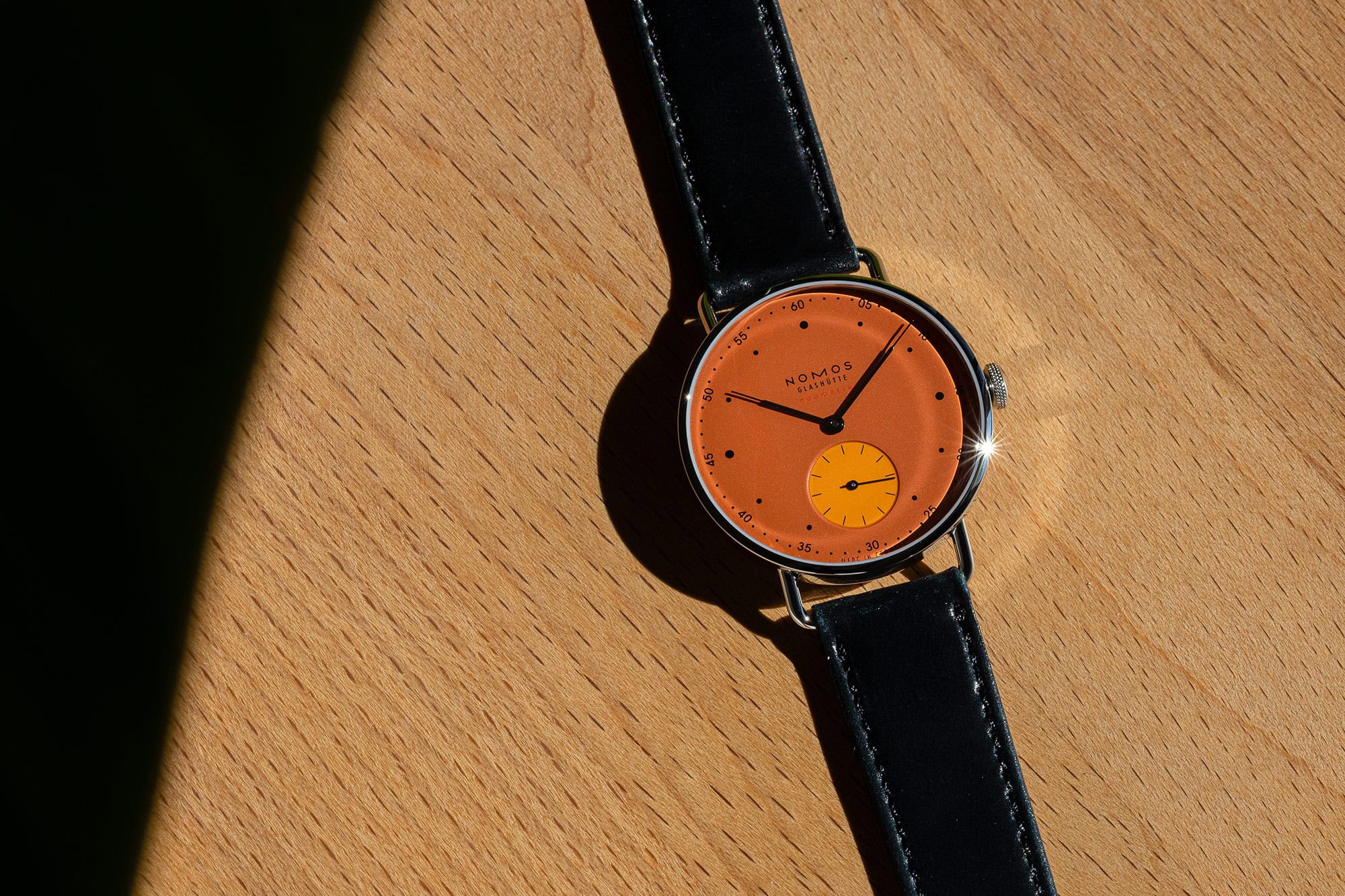 Both Orange models feature round stainless steel bezel-less cases with a crown at 3 o’clock, and a DUW 3001 automatic movement with Nomos’ proprietary swing system and up to 43 hours of power reserve visible through a sapphire crystal caseback. Where they differ is in size and colorway: the Metro neomatik comes in at 35mm in diameter and 42.1mm lug-to-lug, while the Metro neomatik 39 wears larger at 38.5mm in diameter and 45.5mm lug-to-lug. The smaller Metro features a darker orange dial and a lighter orange subdial at 6 o’clock, while the 39 flips the script with a lighter hue on the dial and a darker shade on the subdial.