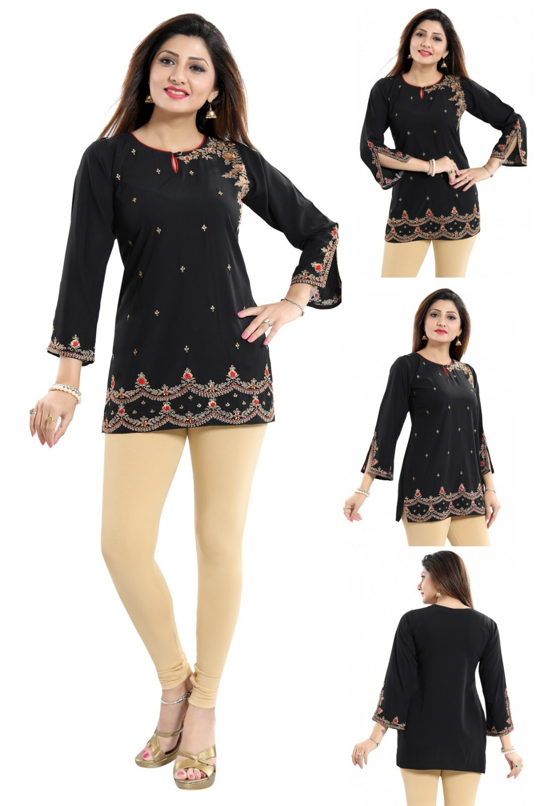 Women Ethnic Top Short Black Embroidery Kurtis Top Tunic Kurta Shirt Dress BD411