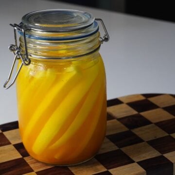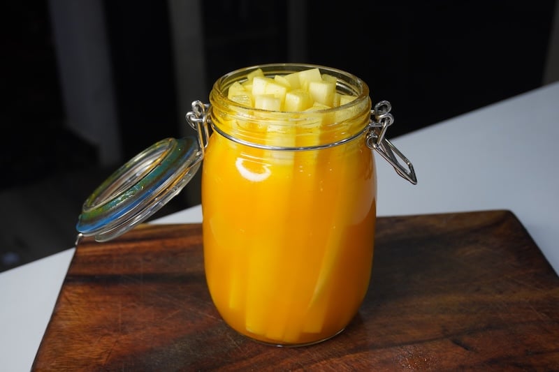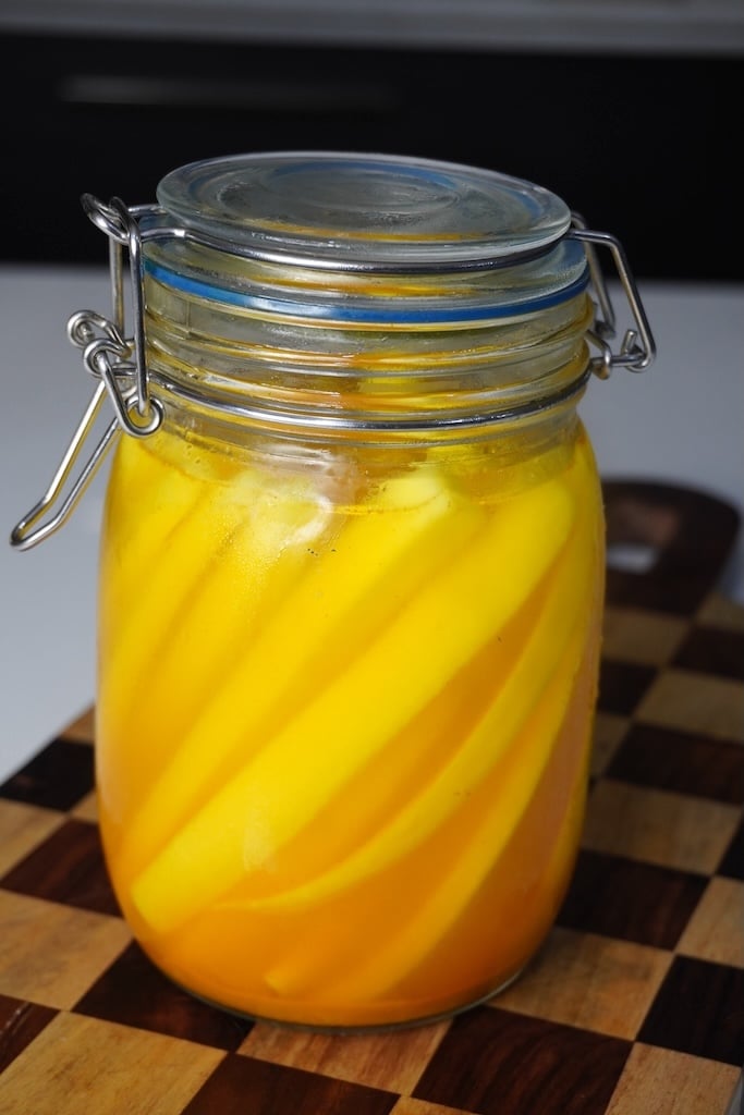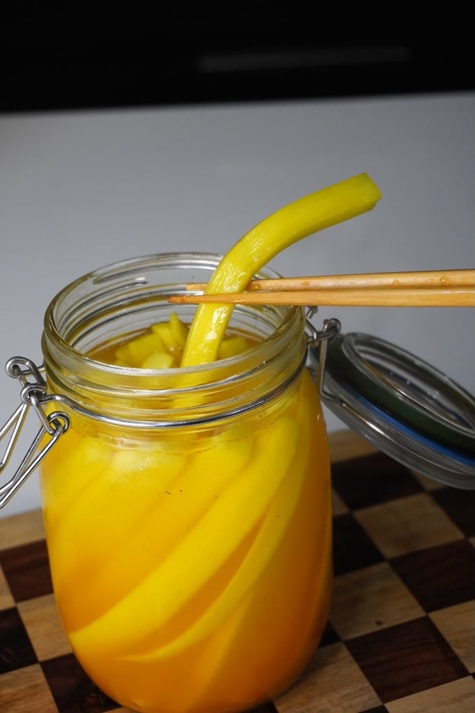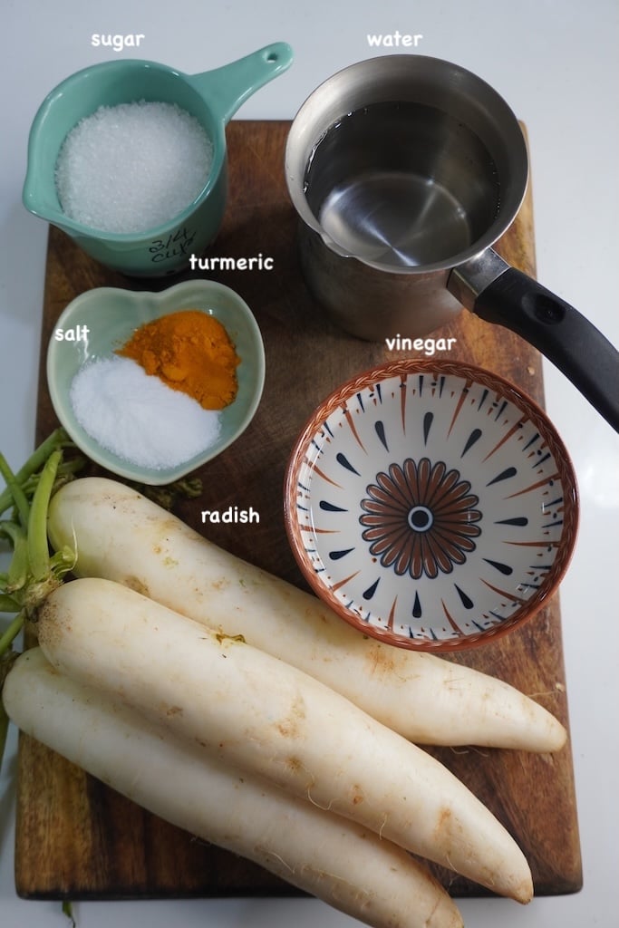 The radish is peeled, cut into long thick strips which is marinated in a simple brine of vinegar, sugar, salt, and turmeric, giving it that signature crunch and refreshing flavour. It’s incredibly addictive, easy to make, and stays fresh in the fridge for weeks.