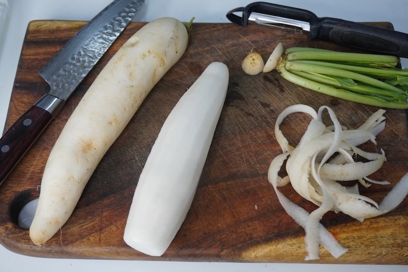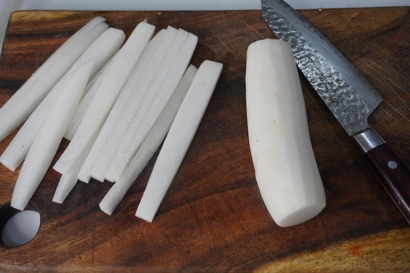 - 500 grams Daikon Radish 2 radish (peeled & cut into long strips)