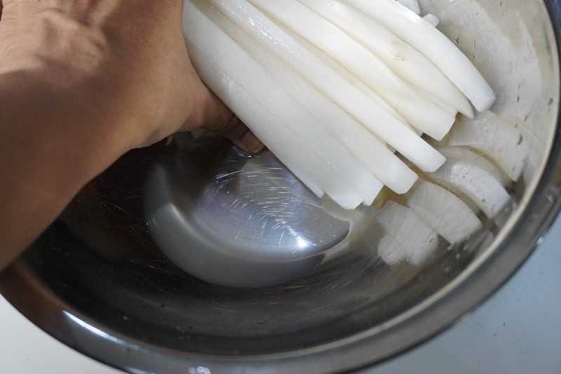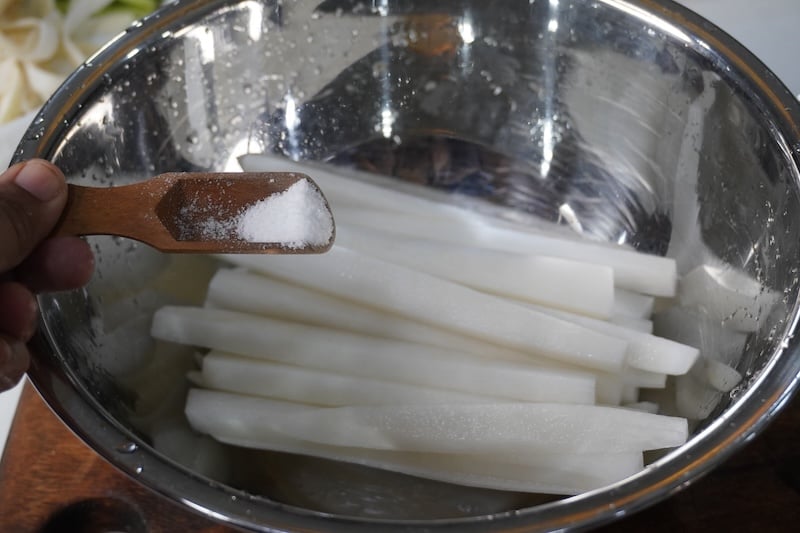 peel radish skin using a peeler. Cut the radish into the length of your container. Cut the radish lengthwise into long strips. Put sliced radish into a large bowl, sprinkle 1 teaspoon of salt over the radish. Rub the salt evenly on radish. Set aside to marinate for 30 minutes.