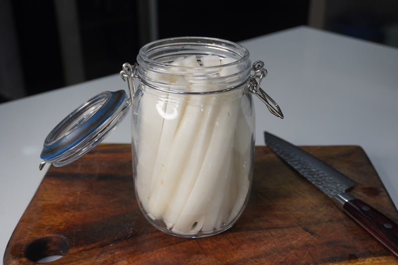 Pour the hot turmeric vinegar mixture over the radish. Let it cool down, cover the lid and keep in the fridge overnight before using.