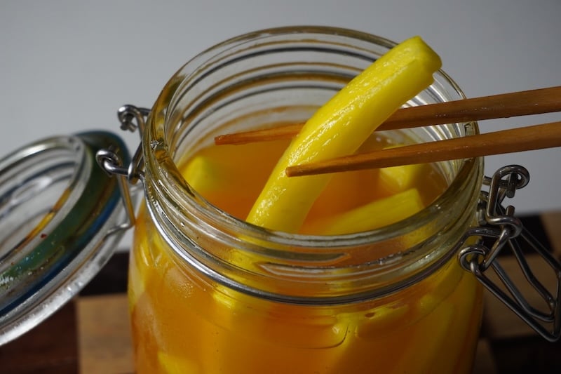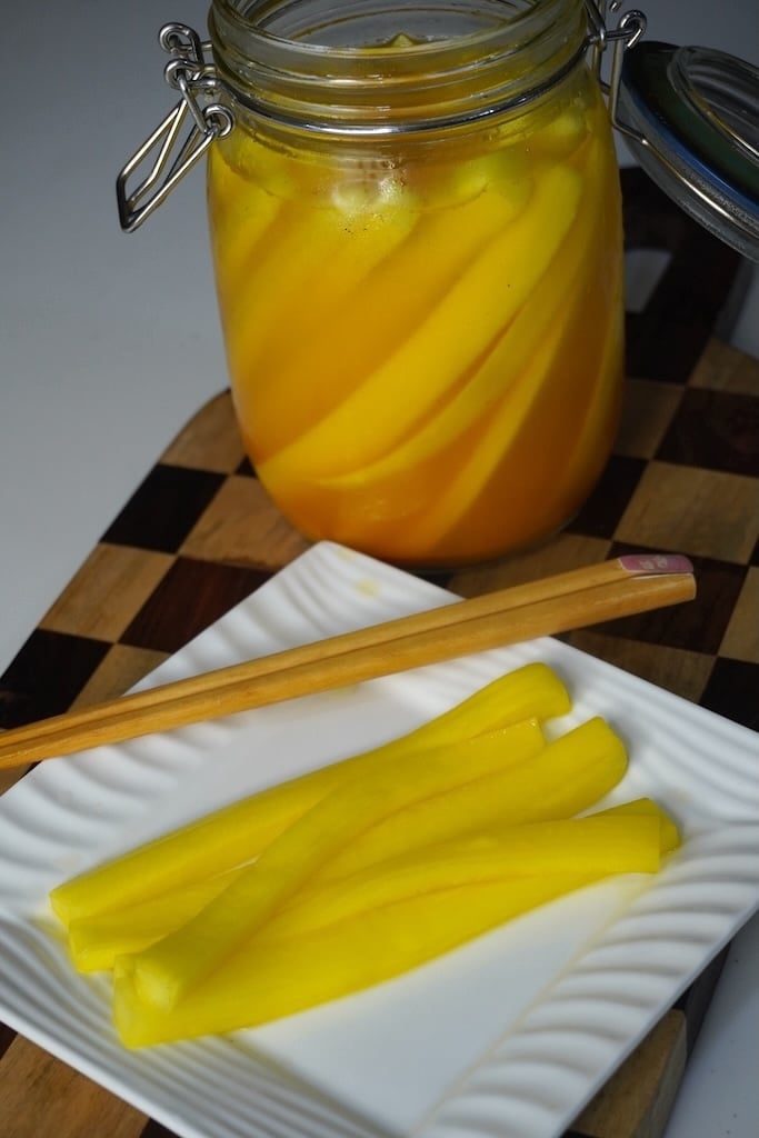 Korean Radish Pickle, popularly known as Danmuji, is a yellow, sweet, salty, tangy pickle made from crisp Korean radish. It’s a staple in Korean cuisine and often served with gimbap, ramyeon, fried chicken, and everyday meals.Â