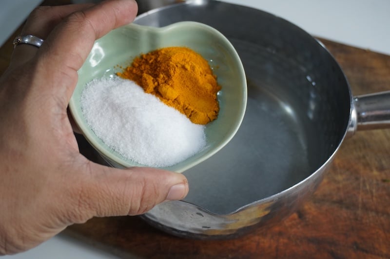 In a saucepan, add vinegar, turmeric powder, sugar, salt, and water. Bring to a boil. Stir until all the sugar has dissolved. Turn off the heat.