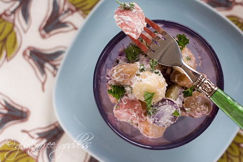 I snatched up a bag of those cute little potatoes at the market yesterday. You know the ones I’m talking about. Those baby sized spuds as cute as a button. In Easter egg colors like custard and purple and pink. So sweet and adorable you want to cradle the bag and speak in your talking-to-kittens voice. Heirloom root vegetable deliciousness. Yeah, you shell out a little extra cabbage for these pretty babies, true. But I say, live a little.