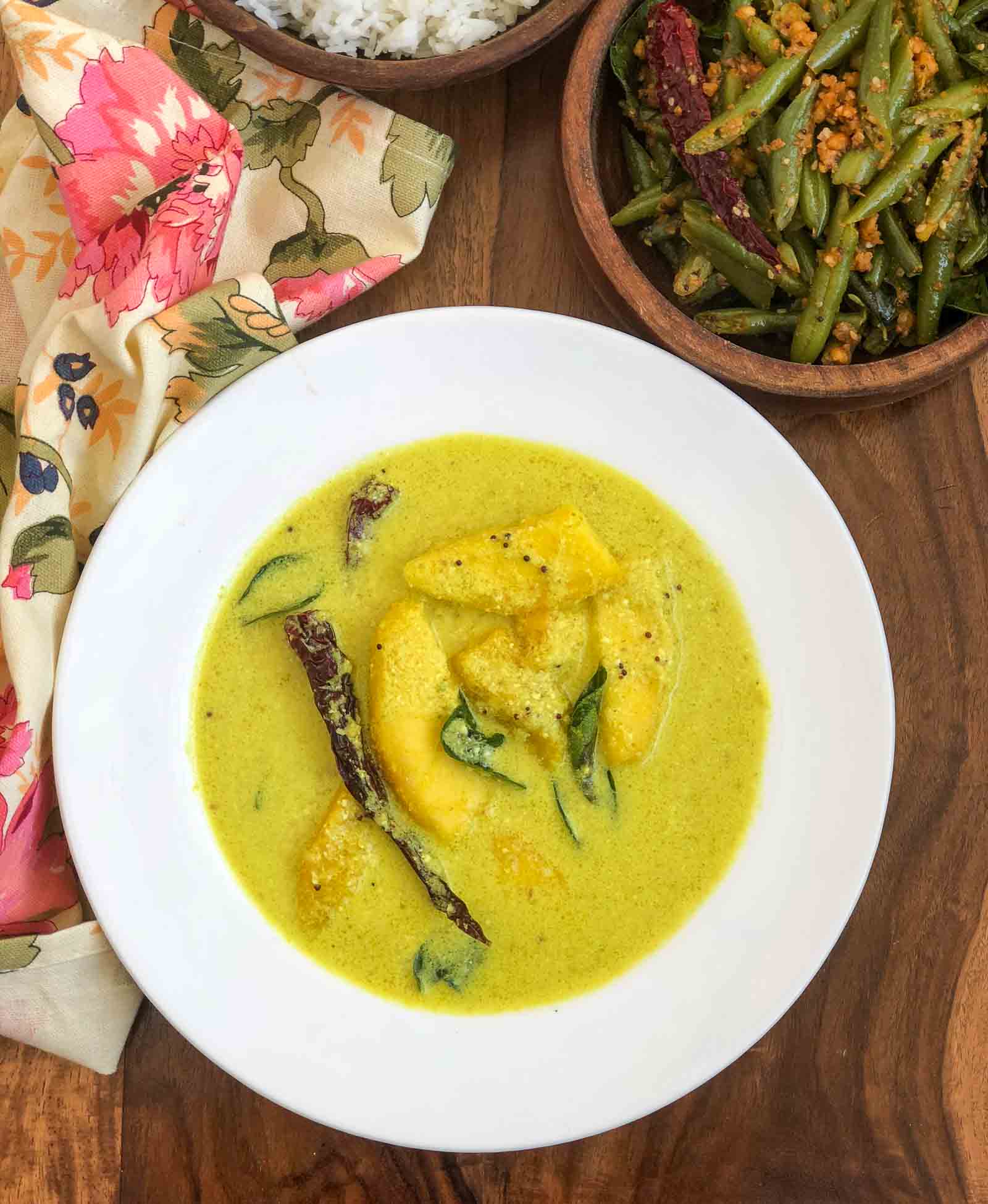 Serve Mambazha Mor Kuzhambu along with Steamed Rice, Chow Chow Thoran and Elai Vadam for a weekday meal.