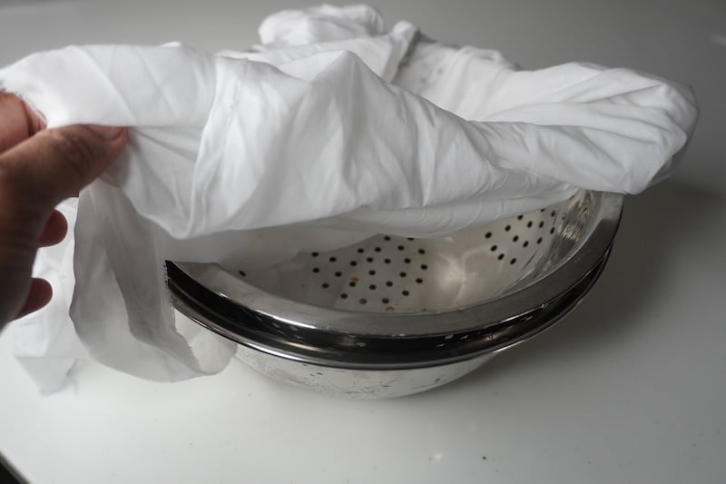 6)Place a colander over a bowl, line the colander with cheesecloth.