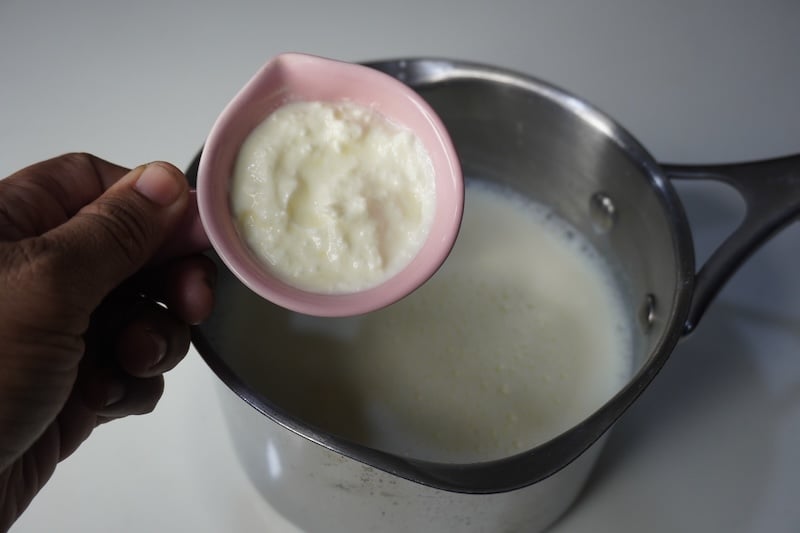 1) Take milk in a sauce pan. Use full fat milk, full cream cow’s milk is best for making greek style yogurt. Once you add milk to sauce pan. Place it on heat and bring it to a boil. Once milk starts to boil.