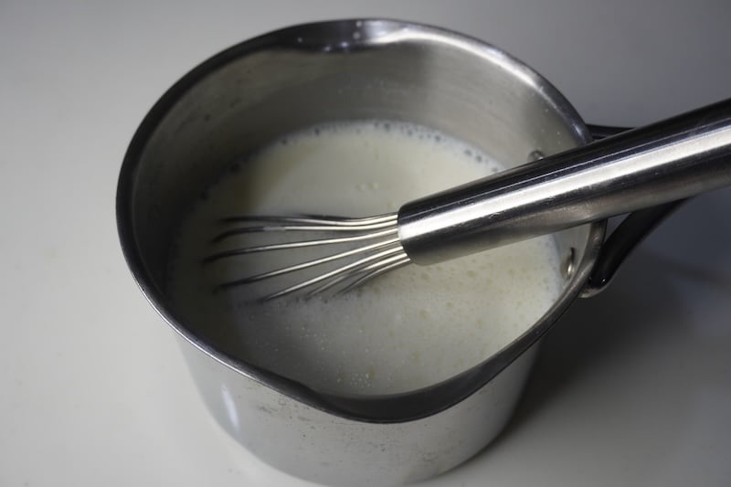 If you insert your finger into the milk it should feel warm to touch. The temperature of the milk will be 185 degrees F (85 degrees C) to be exact.