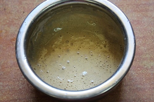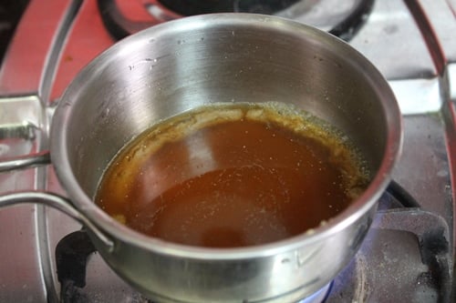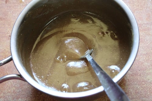 Take a clean saucepan, add in 1 tablespoon of karupatti. Now pour ¼ cup of clean water. Heat this up and cook until the karupatti is melted.