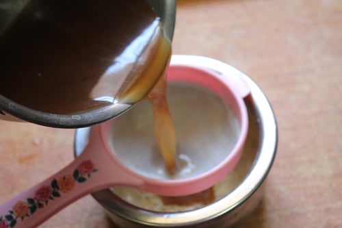 Now place a fine mesh strainer over the bowl and Sieve the karupatti liquid through this. Mix this well.