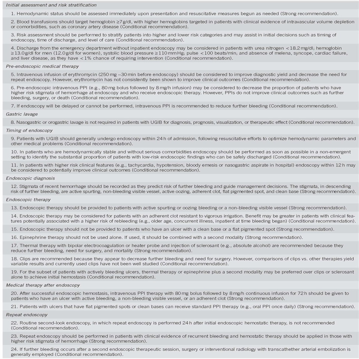 9. Patients with UGIB should generally undergo endoscopy within 24 h of admission, following resuscitative efforts to optimize hemodynamic parameters and other medical problems (Conditional recommendation, low-quality evidence).