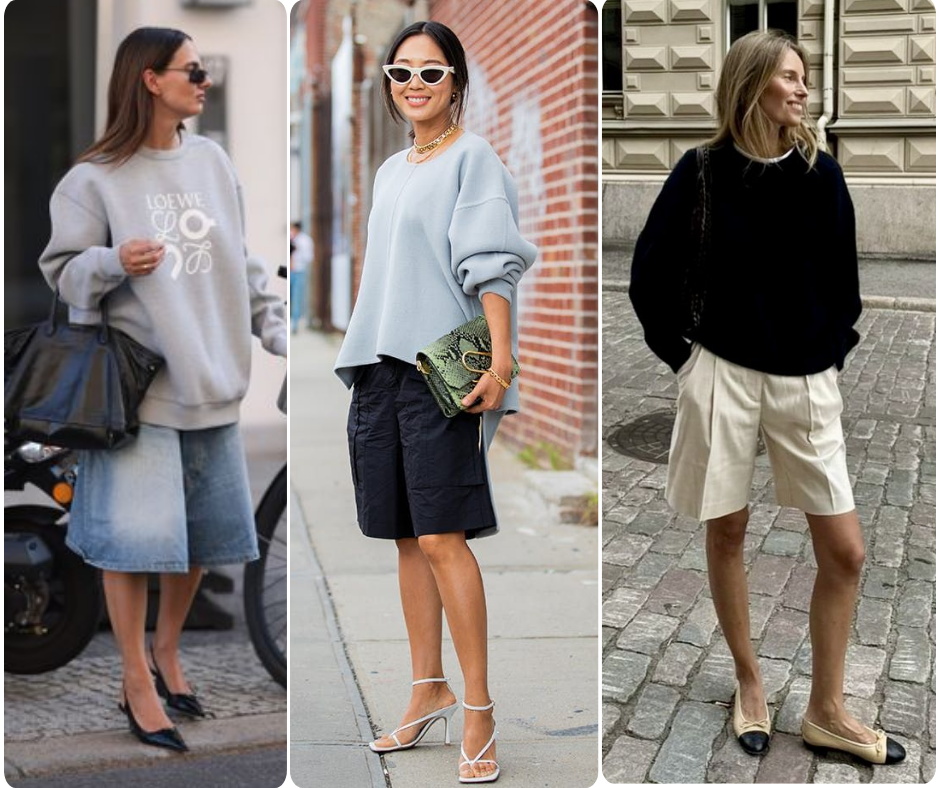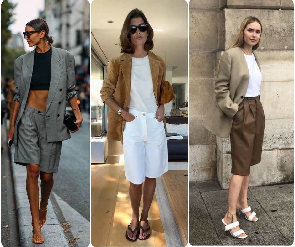 Asadar: la bermudele din dotare adaugam un sacou oversize, cu umerii clar definiti. Este un gen de combinatie care destabilizeaza codul vestimentar clasic, pe care il asociem costumului cu pantaloni, iar cele doua piese nu mai au acel aer solemn, riguros. Pentru ca tinuta sa isi pastreze totusi un aer elegant si profesional, recomandarea mea este sa urmariti unitatea cromatica sau tonala (culori sau nuante cat mai apropiate intre cele doua), dar sa cautati texturi diferite. Va incaltati cu o pereche de escarpeni cu toc mediu sau inalt, de preferat o incaltaminte cu forma moderna. Rezultatul este o silueta respectabila, dar nu rigida sau conservatoare.