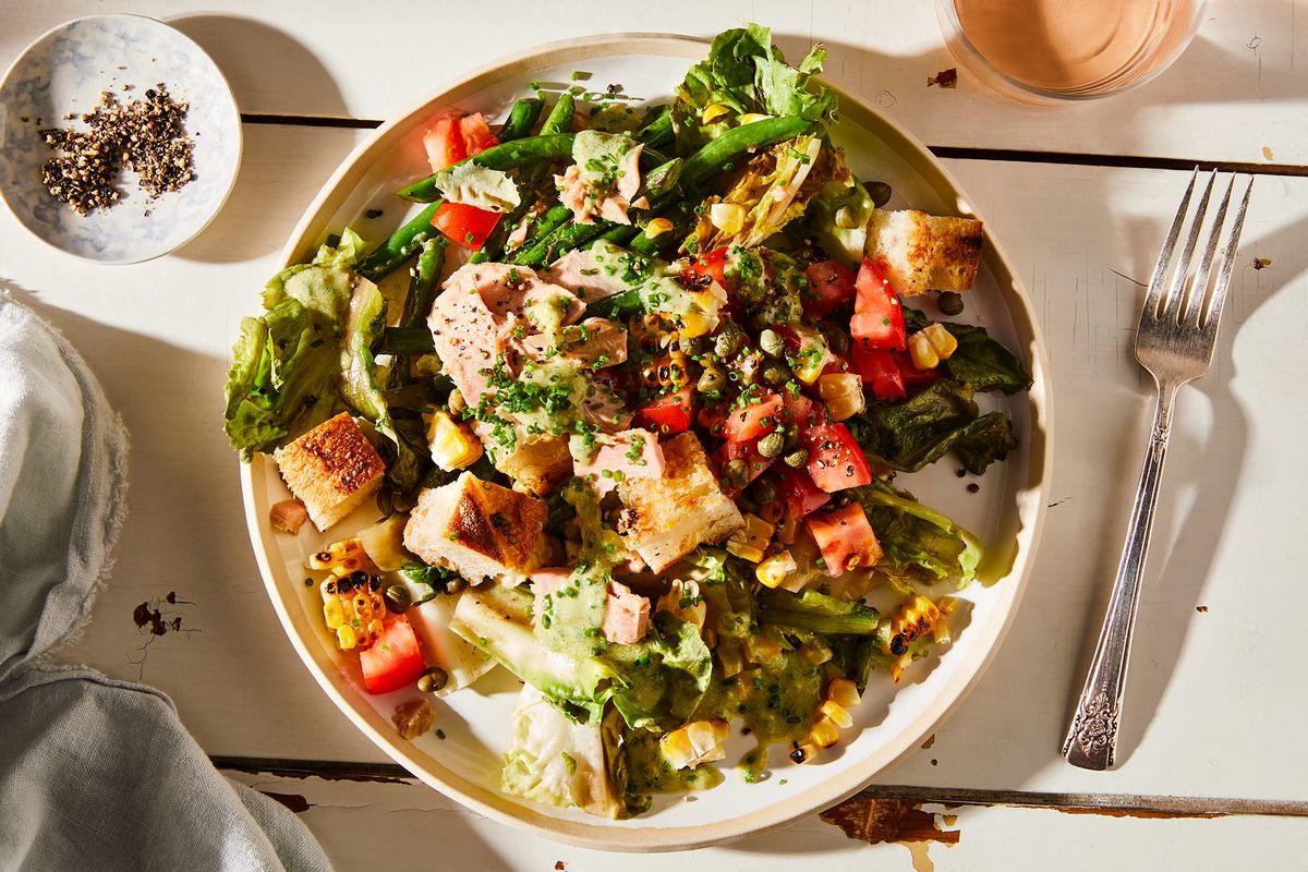 Afresh take on the classic Italian bread salad. It combines toasted ciabatta cubes with seasonal vegetables like asparagus, English peas, and snow peas, all tossed in a basil-mint pesto.