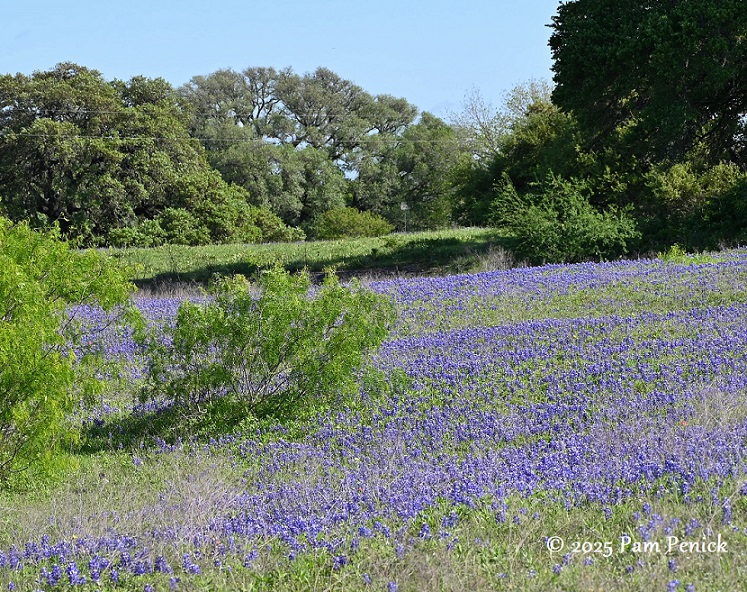 For our wildflower safari last Thursday, we drove east to Giddings and then meandered along two-lane farm-to-market roads between Giddings and Independence. A blue haze in the distance finally hinted at what was ahead — a field of bluebonnets!