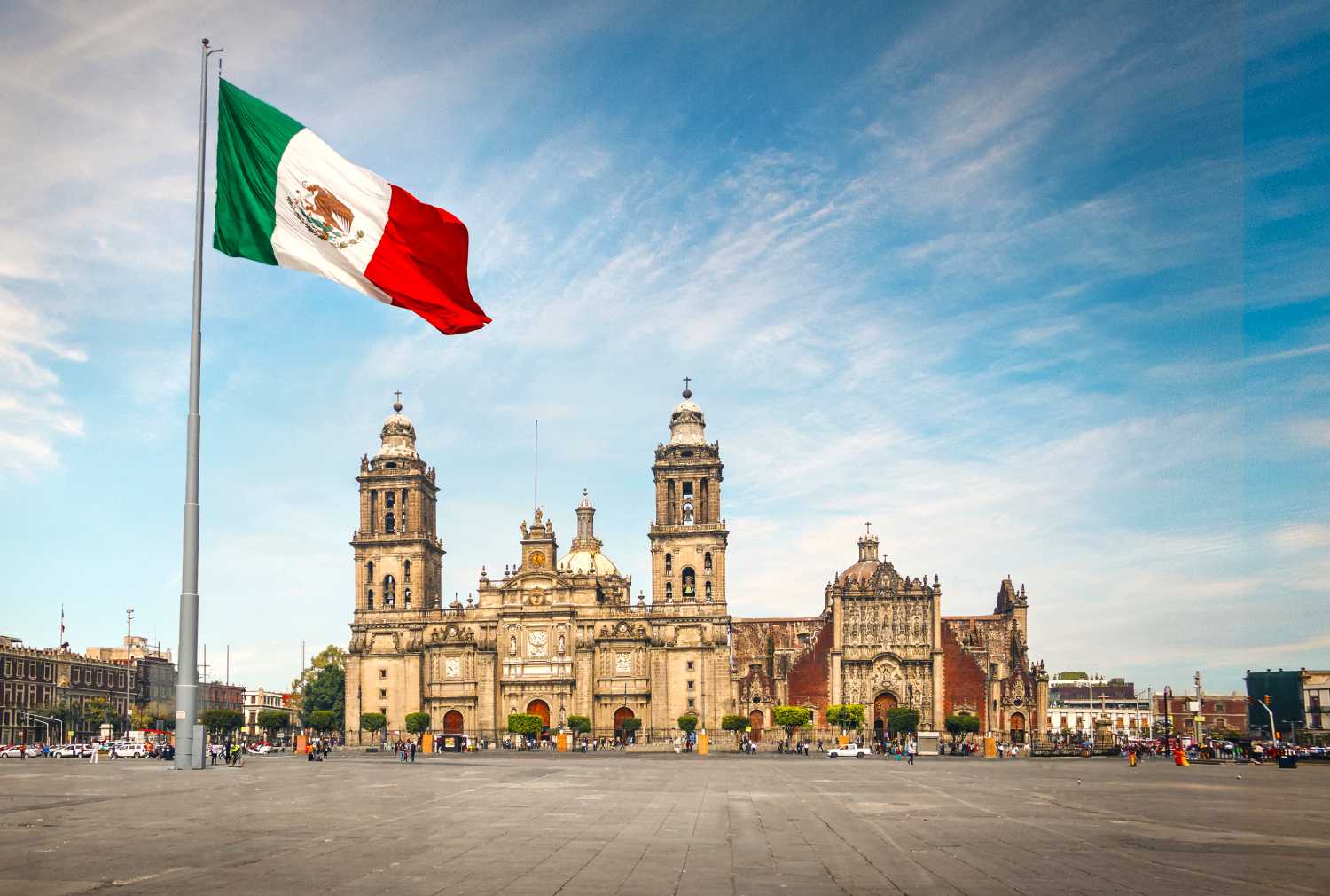 The plaza is surrounded by impressive historical buildings and landmarks like the Metropolitan Cathedral and the Palacio Nacional (National Palace.)