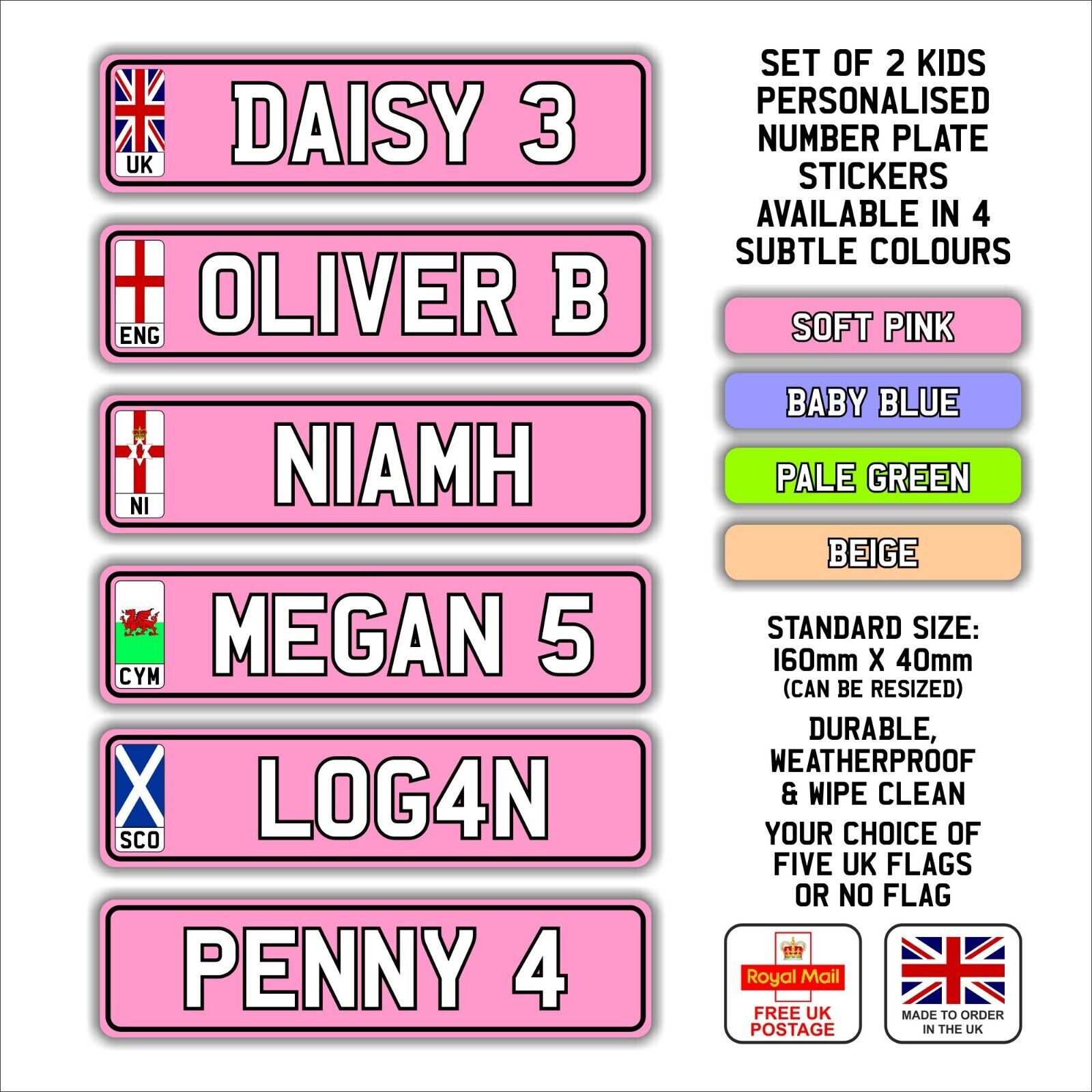 2 Personalised Number Plate Stickers For Kids Ride-On Toys – Waterproof – Pink