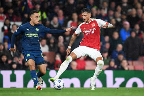 LONDON, ENGLAND – SEPTEMBER 20: Sergino Dest of PSV Eindhoven and Ben White of Arsenal battle for possession during the UEFA Champions League match between Arsenal FC and PSV Eindhoven at Emirates Stadium on September 20, 2023 in London, England. (Photo by Stuart MacFarlane/Arsenal FC via Getty Images)