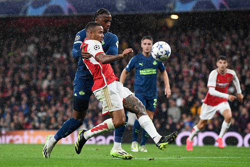 LONDON, ENGLAND – SEPTEMBER 20: Gabriel Jesus of Arsenal is challenged by Armel Bella-Kotchap of PSV Eindhoven during the UEFA Champions League match between Arsenal FC and PSV Eindhoven at Emirates Stadium on September 20, 2023 in London, England. (Photo by Stuart MacFarlane/Arsenal FC via Getty Images)