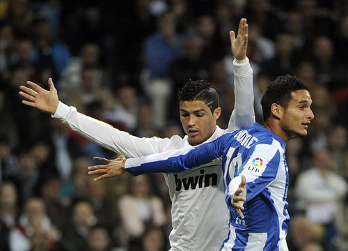 Real Madrid’s Portuguese forward Cristiano Ronaldo (L) vies for the ball with Real Sociedad’s Algerian defender Liassine Cadamuro الجزائري لياسين بن طيبة كادامورو during the Spanish league football match Real Madrid against Real Sociedad at the Santiago Bernabeu stadium in Madrid, on March 24, 2012.