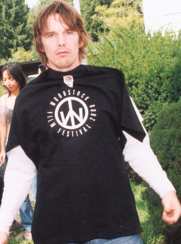 Ethan Hawke tries on a Woodstock Film Festival shirt.