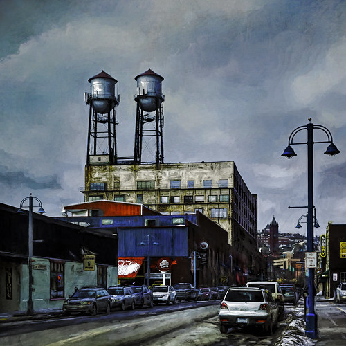 Tagged: , watertower , lookouts , standing watch , twin towers , duluth , minnesota , lake avenue , canal park , winter , urban , cityscape , street scene , streetlights , cars , historic , lake superior , bigtownhicks , Barbara Grether