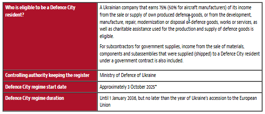 - The Defence City regime is separate to, and may not be combined with, other preferential tax regimes, such as Diia City, simplified tax and other corporate income tax-exempt status, including charitable organization benefits.